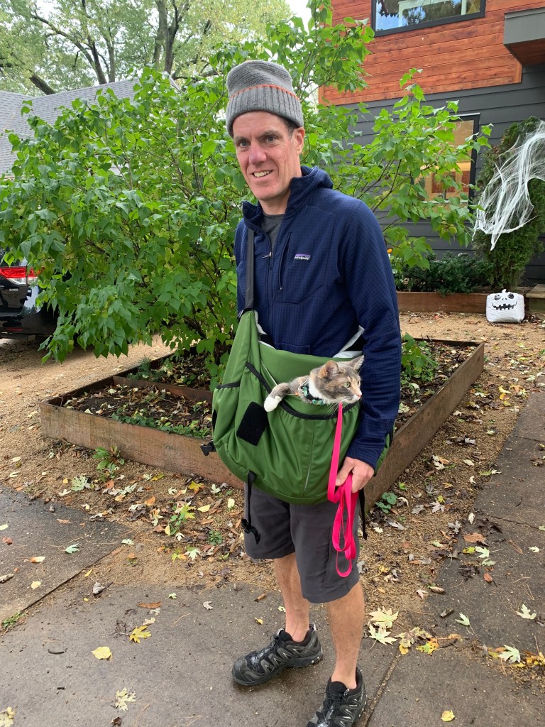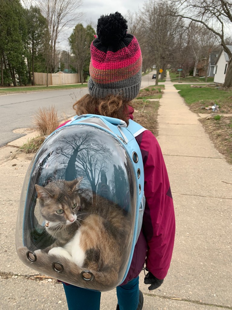 Is kitty preparing for Space X? Perhaps a mini single cat subarmine? Alas it is just a backpack with an awesome perch for a pet. Kitty loves the new backpack. She seems to know the work walk! She and dog are now going on walks together! We’ve been taking kitty on longer and longer walks. She appears alert and interested in all the sounds, animals, and new places. We’ve all enjoyed taking her out for walks.