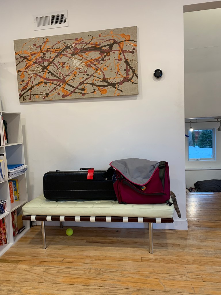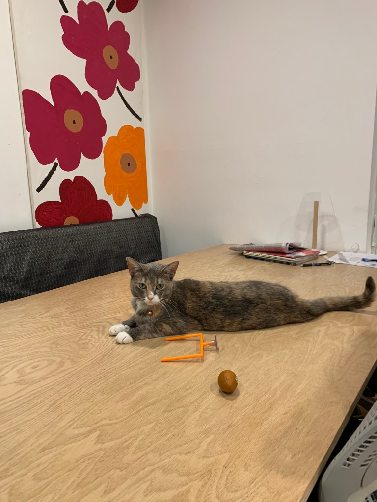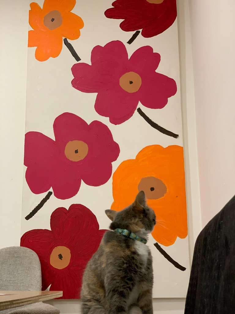 We finally finished a long overdo art project. Kitty appeared to admire the work. Happily she’s not tried climbing the canvas yet.