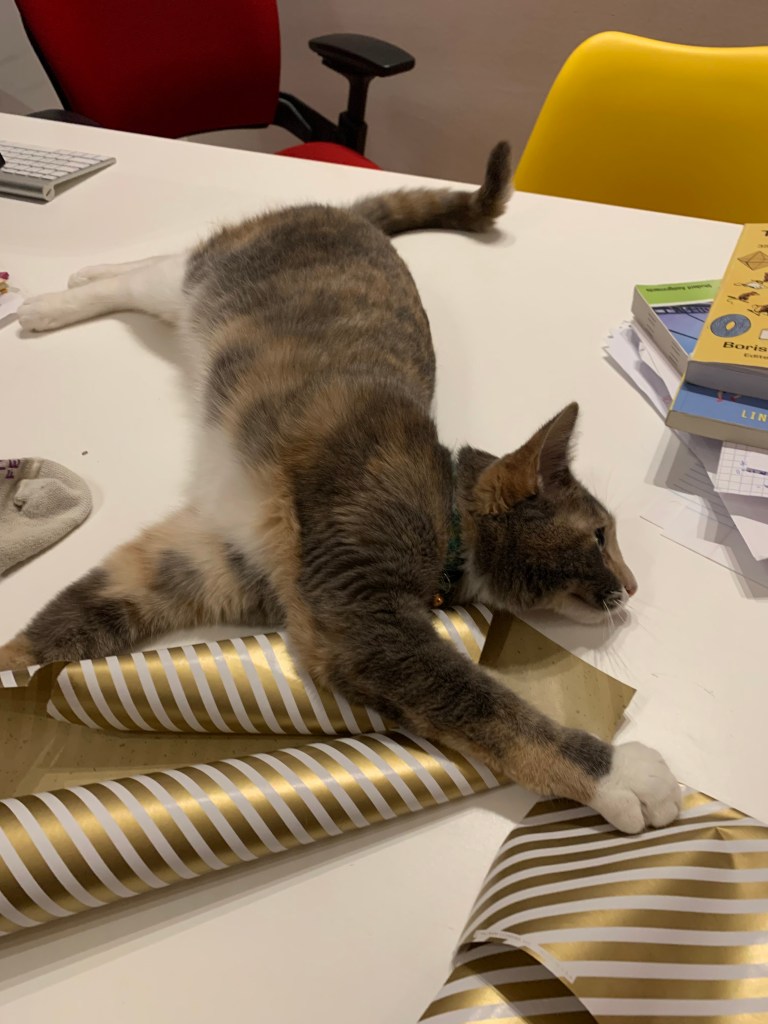 Recently we’ve celebrated a number of birthdays. Kitty believes it is Christmas in Spring. Each time she hears scotch tape she comes trotting on into the room. It seems she can hear scotch tape from a great distance away. I’m not sure if she likes it, but she’s definitely curious about it. I always give her a small piece. First I stick a bit on her fur because she’s very demanding about investigating. She peels it off her fur, it gets stuck on her paw, she pounces on it, tape gets stuck again and so on. Eventually I put the tape on something with the sticky side exposed. She then batts it around a little more before loosing interest. If not the tape the wrapping paper or rather the sound of scissors cutting wrapping paper draws her attention from anywhere. I’m not sure why, other than she appears to love paper.