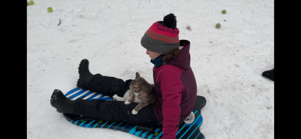 Sledding Kitty!!! We finally got snow and were pleased to see how stoked kitty was. Despite arctic temps she is at the patio door in the am pushing the dog aside to get out. She seems to like digging/rolling in snow. Olympia thought it would be fun to try her on the sled. I was hesitant. Kitty seemed to enjoy it!