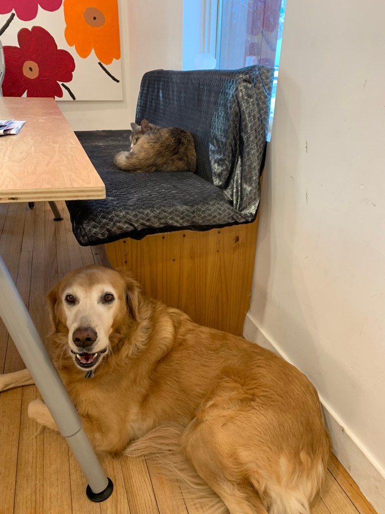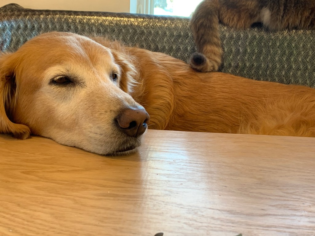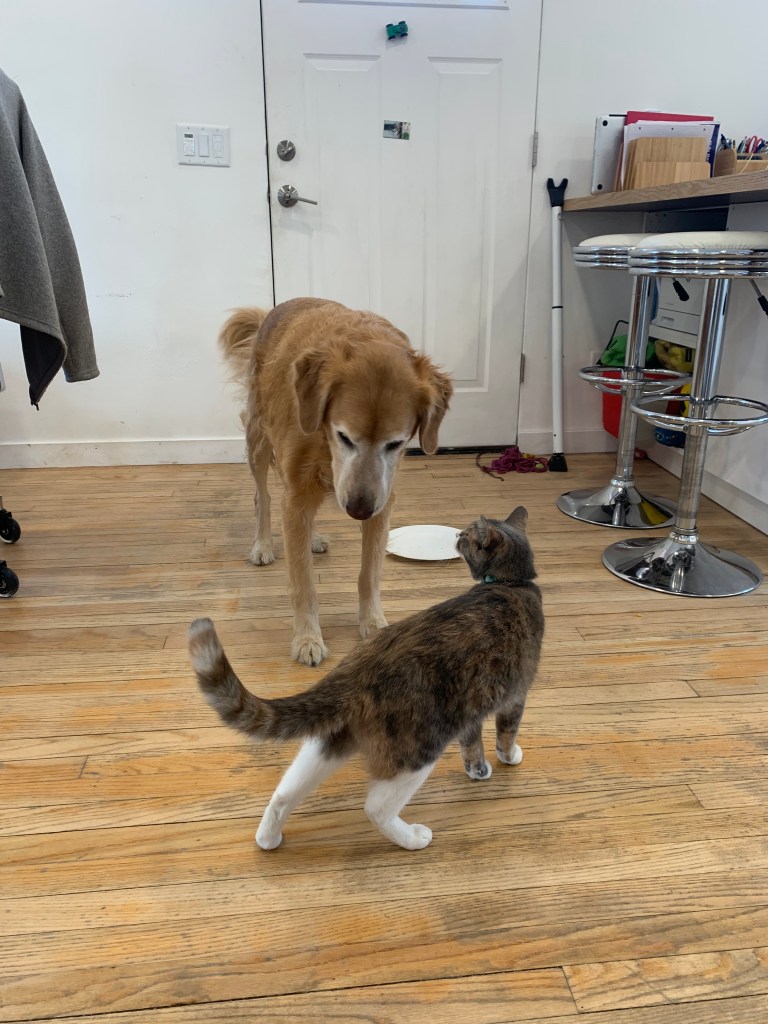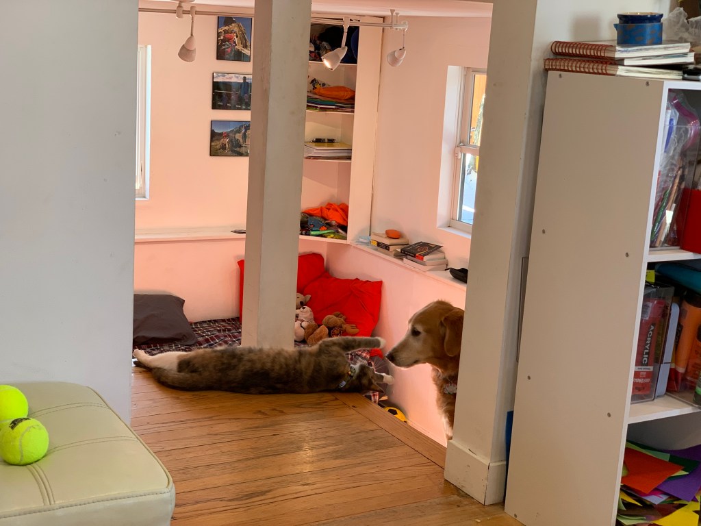 Dog fooled by diminutive kitty relented the comfy bench and premium access to the street side window. Dog unaffected by kitty tricks finds luscious ball and squeaks ball loudly and incessantly disrupting kitty’s nap.