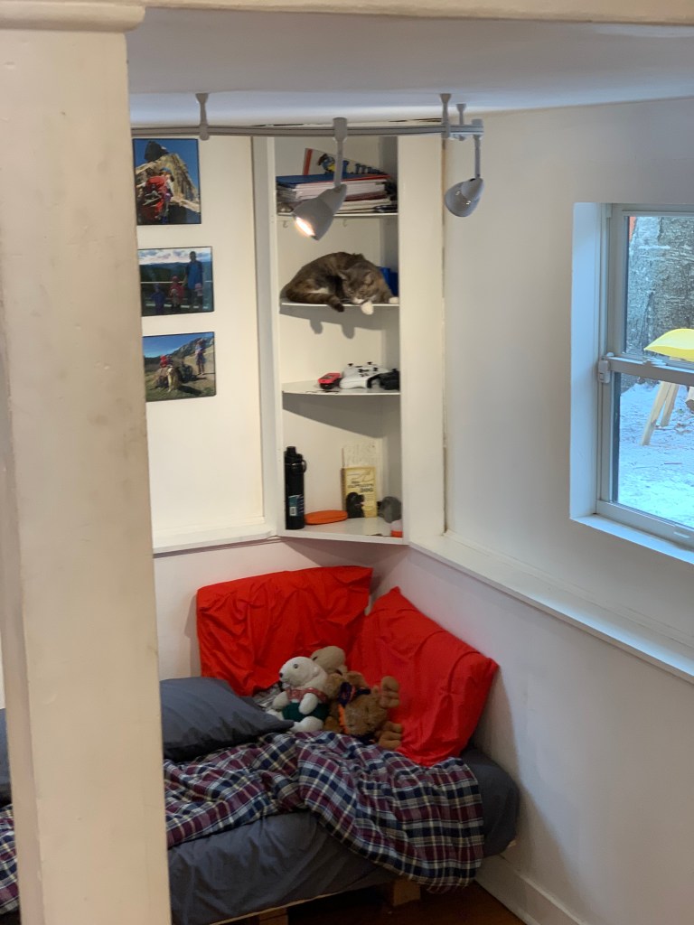 Kitty continues to find new sports to chill out, hide, relax, and observe. Couldn’t find kitty the other day. Looked all over. Eventually fond her hiding spot.