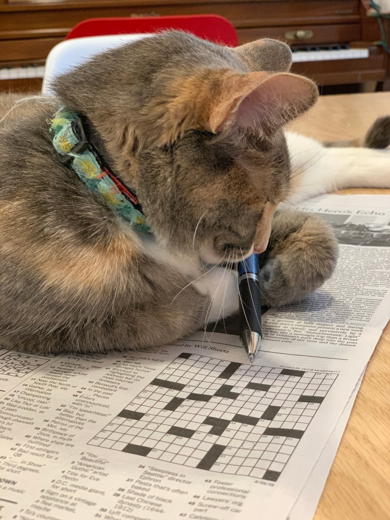 Kitty loves the newspaper. She lounges on it regularly. She seems to like the slight warms and softness it adds to the dinning room table. A full paper is best, followed by a section, and last a single sheet. Kitty seems to really like the crossword section. I haven’t seen her fill in any squares and she doesn’t seem to have many ideas for answers, except for ‘meow’ and ‘purrr’. One of these days she’ll be correct. Until then we’ll have to keep telling her, ‘nice try’ and assure her ‘that was a good guess’.