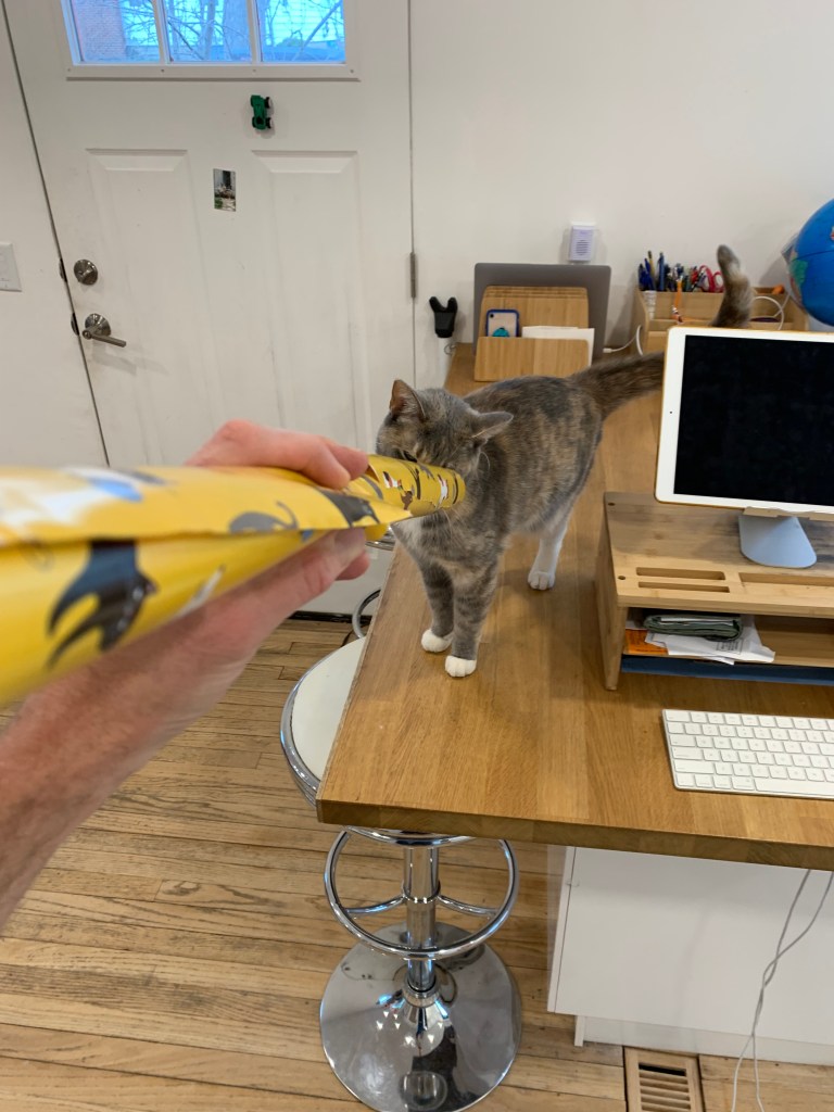 Kitty seems to really love tape. She doesn’t miss a change for a piece of tape. All Christmas she was ready to wrap. Amazon return boxes she’s ready to seal shut. Recently I put blue painters tape on the wall where we might widen a couple of doorways. Never expected the thin blue tape to provide so much entertainment for kitty.