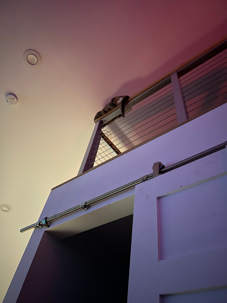 She hasn’t fallen yet. We are however, a bit concerned with her overconfidence. While not pictured here, she’s dangled up to two paws while sleeping on the railing.