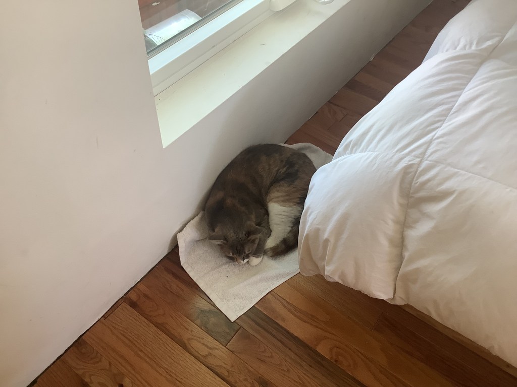 we found kitty snuggled into a washcloth on the floor. we’d put the washcloth there because of Minisplit ac leak. Other small pleasures have recently included sponges. Nearly every morning we are finding at least one kitchen sink sponge on the floor. We’ve not seen her playing with them.